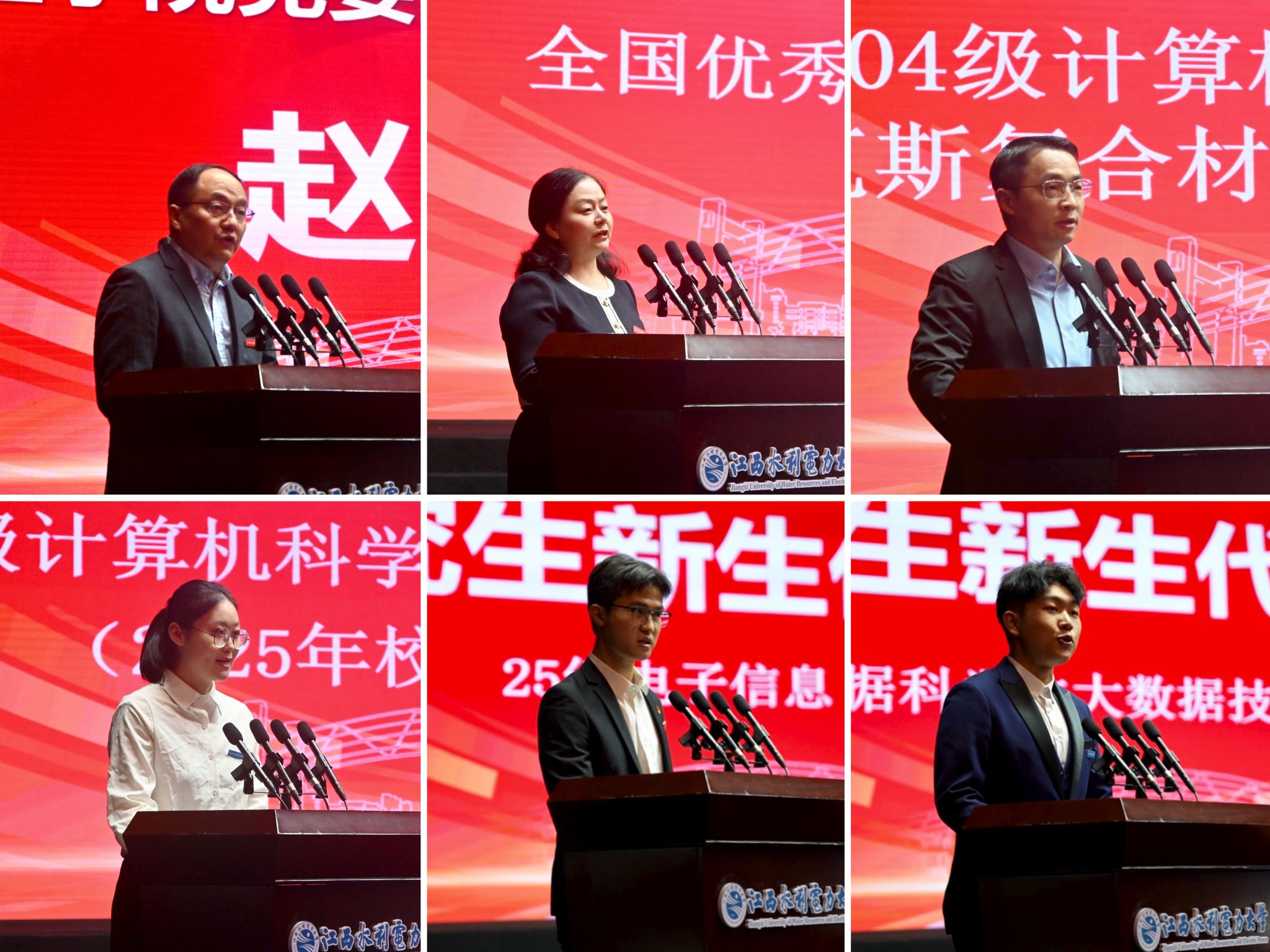 典礼中,信息工程学院负责人作院情介绍,希望同学们在大学生涯中练就真本领。全国优秀教师王颖鼓励同学们把握成长契机,学有所成、思有所得、不负韶华。校友吴英春回忆了自己求学之路和工作经历,感谢母校、母院和班主任王白晶老师的培养,希望同学们在信息工程学院这个大家庭里创造自己的精彩。校“最美大学生”、2022级计算机科学与技术专业郭文萍同学勉励学弟学妹们寻找适合自己的赛道,主动抓住机遇、积极参与社会实践。研究生新生代表、2025级电子信息专业肖文强同学表示同学们要加强跨学科协作、结合产业与区域发展做研究,以智慧点亮水利电力的新篇章。本科生新生代表、2025级大数据科学与技术专业刘融晋同学分享了开学期间遇到的暖心瞬间,期待与同学们从江水出发,以数据为舟,以初心为桨,一起驶向那片值得期待的科技未来。