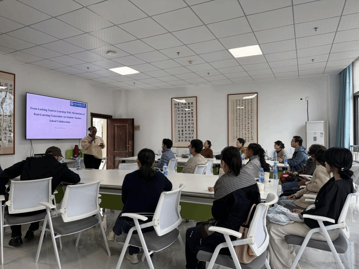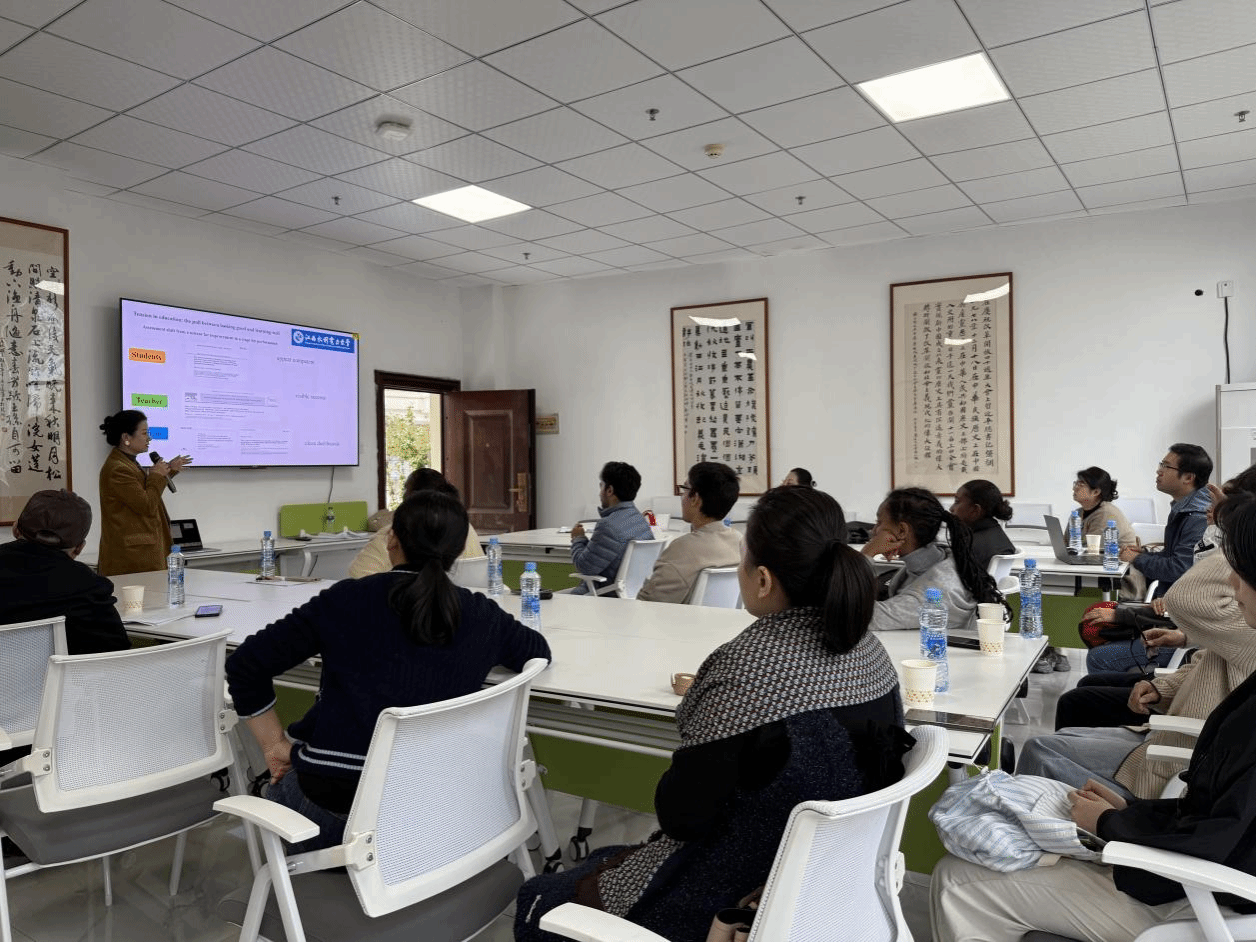 本次沙龙由Gontse Christine Morifi主持。外国语学院李天欣博士以“From Looking Good to Learning Well: Mechanisms of Real-Learning Generation via Student–Teacher–School Collaboration”为题作学术报告,重点阐述了教师与学生协同学习机制及促进真实学习的路径。报告内容结构严谨、论证充分,有效助力我校教师英语教学能力提升,为教学实践与师生互动提供了有益参考,引起了师生们的热烈讨论。交流阶段,信息工程学院涂振宇教授介绍了英文版《水宝宝之歌》的创作思路。师生们积极献言献策,对该歌曲的创作提供了宝贵意见,并学习演唱该歌曲。