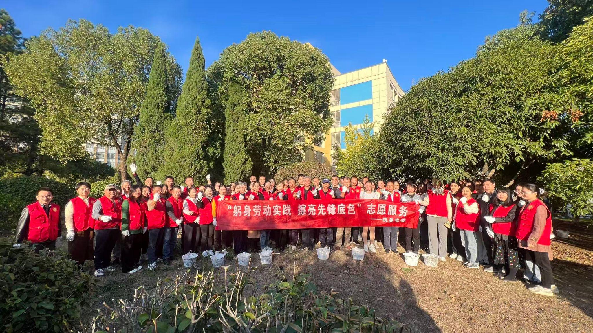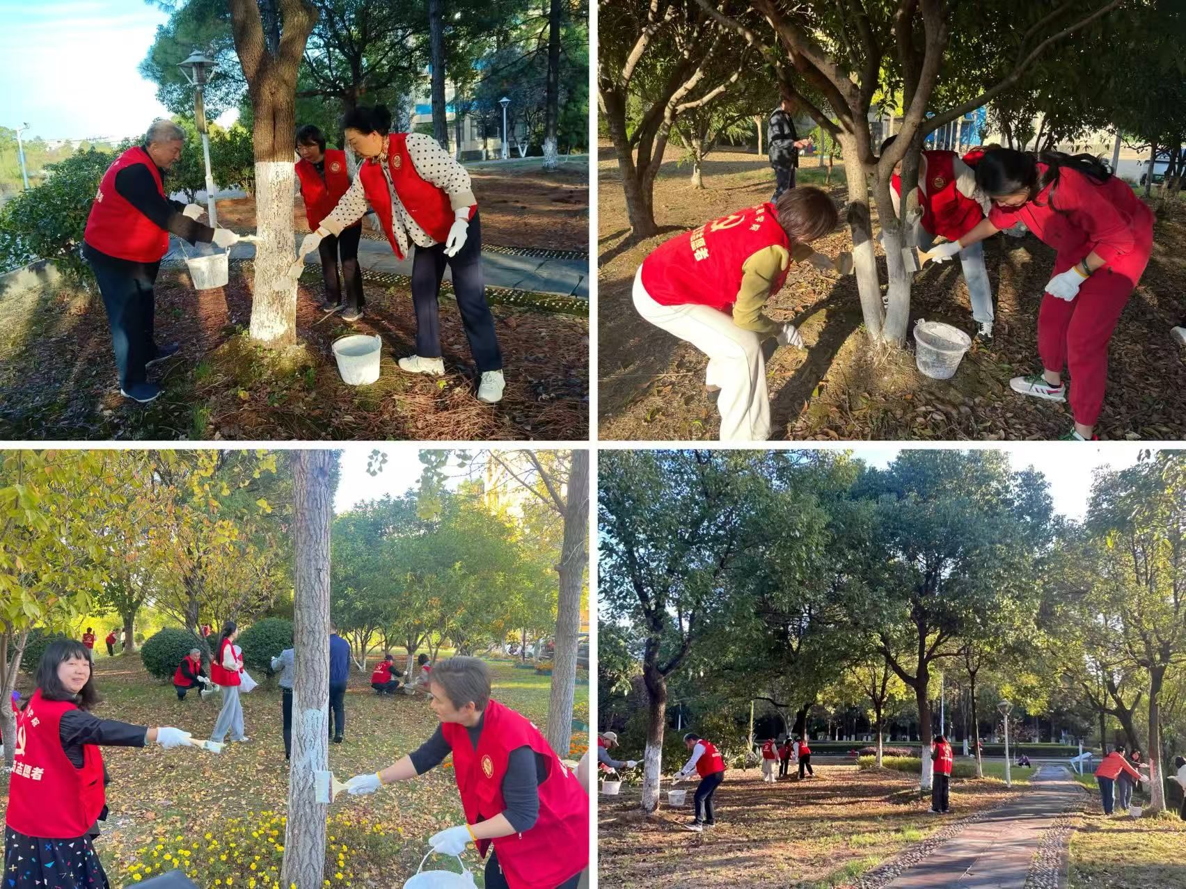 11月14日,机关党委组织开展了“躬身劳动实践 擦亮先锋底色”党员志愿服务活动,对行政楼周边树木进行“刷白”养护,助力树木防虫防冻、安全越冬。机关70余名党员干部参加活动。