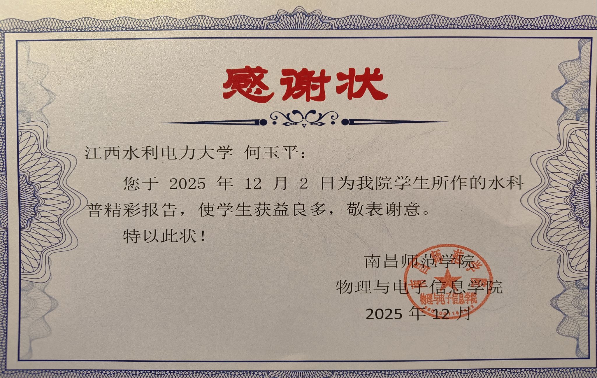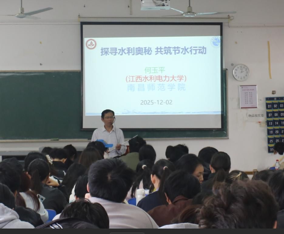 12月2日,我校水文化研究中心、理学院教师何玉平携水科普教育研究团队赴南昌师范学院,开展题为《探寻水利奥秘 共筑节水行动》的水科普教育宣讲活动。