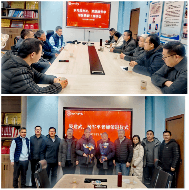 1月27日,机械工程学院为晏建武、杨军平两位教授举办了一场简朴而温馨的荣休座谈会,向他们颁发荣休纪念品并献上鲜花。学院全体负责人、工会委员与教师代表齐聚一堂,共同致敬两位教授数十载的奉献岁月。