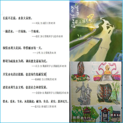 活动中,师生积极参加瑶湾水利风景区宣传画、宣传口号征集和线上分享会等活动,各班级签订了《保护水源水质节约用水行为规范》承诺书。在“参观校园瑶湾水利风景区 传承新时代水利精神”主题线上分享会中,学院学生党支部以介绍瑶湾水利风景区和分享先辈治水故事的形式,将活动与党建铸魂育人相融合,让新时代水利精神深深扎根在基层党支部。