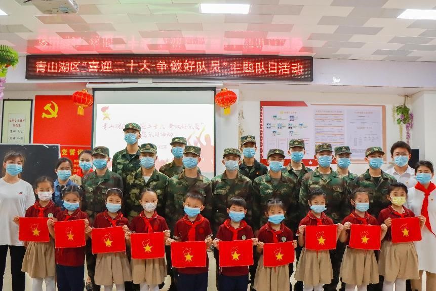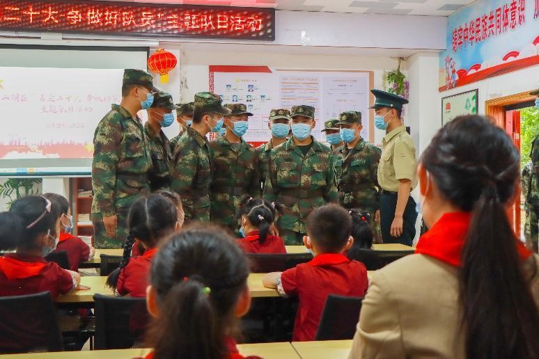 活动中,士官生穿上迷彩绿装为少先队员们表演了红色情景剧《红军少年先锋队》,生动讲述了1932年甘肃省正宁县三泉原,红军少先队跟随红军游击队打土豪、分粮食、学文化、学军事、宣传革命精神,以及反围剿时期少年先锋队配合红军游击队抵抗围剿敌人的感人故事,再现了少年先锋队员不怕牺牲的精神风貌。大家还与少先队员们分享了学习习近平总书记在庆祝中国共产主义青年团成立100周年大会上的重要讲话精神学习体会。