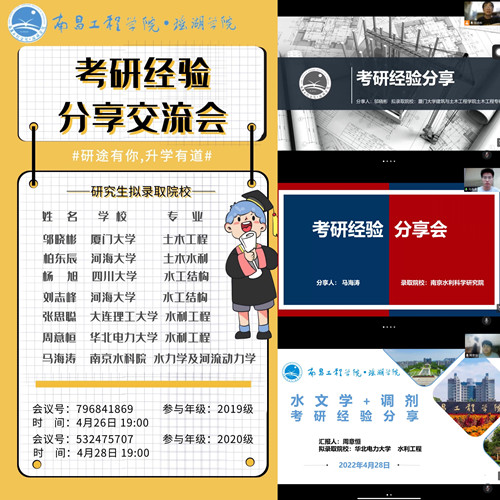 交流会上,7位考研拟被录取的2022届毕业生就院校选择、时间安排、方法技巧和心态调整等方面进行了分享,为即将踏上考研征程的同学答疑解惑。拟被大连理工大学水利工程专业录取的张思聪政治单科81分,他分享了政治复习备考方法,对考研过程中心态调整提出了建议;拟被河海大学土木水利专业录取的柏东辰英语考了88分,他讲述了英语学习的小妙招;拟被录取四川大学水工结构专业的杨旭分享了考研数学的复习方法和复习时间的统筹安排;拟被录取河海大学水工结构专业的刘志峰专业课接近满分,他就考研复习材料的准备和专业课程复习畅谈了体会;拟被录取厦门大学土木工程专业的邬晓彬总分376分,他讲述了自己在考研目标确定、心态调整和学习安排等方面的方法策略;通过参加南京水利科学研究院暑期夏令营获得优秀学员提前锚定目标院校的马海涛,对科研院所与普通高校做了比较分析;调剂到华北电力大学土木水利专业的周意恒分享了在分数不占优势情况下的报考和调剂经验。在互动交流环节,同学们积极提问,老师和学长耐心细致解答,分享交流会气氛热烈。