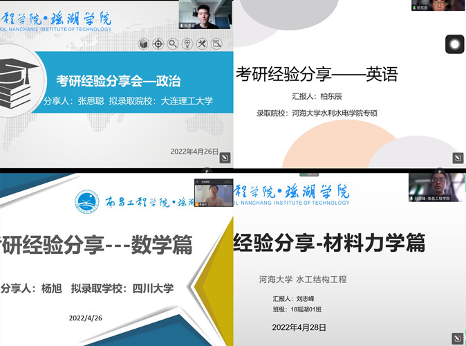 4月27日至29日,瑶湖学院针对不同年级举办了两场考研经验“云端”分享交流会,学院班子成员、专业导师、学业导师、辅导员和100余名学生汇聚云端参与活动,帮助有志考研的学生坚定信心,积极备考。