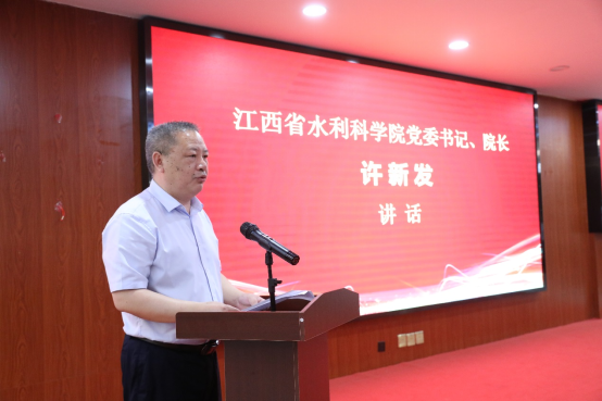 许新发代表协同单位发言。他对我校智慧水利产业技术研究院的成立表示祝贺,希望今后能和协同单位同心协力,加快融入江西经济社会发展,打造智慧水利合作平台,深化拓展与行业企业的战略合作,创新校地、校企合作模式,落实对接机制,促进智慧水利科技成果的转化与产业化。
