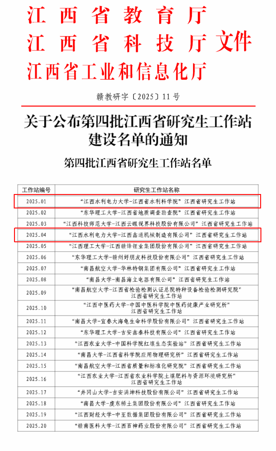 近日,江西省教育厅、江西省科技厅、江西省工业和信息化厅联合发布《关于公布第四批江西省研究生工作站建设名单的通知》(赣教研字〔2025〕11号)。经申报、资格审核、专家评审、现场答辩及复核审定等多轮严格遴选,我校水利工程学院与江西省水利科学院共建的“江西水利电力大学-江西省水利科学院”研究生工作站、机械工程学院与江西鑫通机械制造有限公司共建的“江西水利电力大学-江西鑫通机械制造有限公司”研究生工作站,成功获批第四批江西省研究生工作站。本批次全省共立项20个省级研究生工作站。
