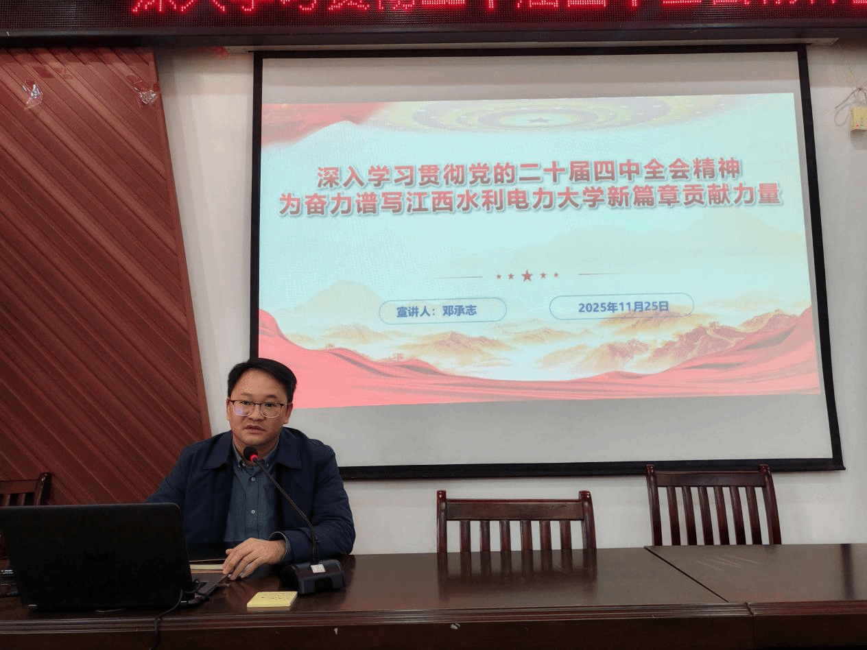 根据学校党委统一安排,11月25日,人文与艺术学院学习贯彻党的二十届四中全会精神宣讲会在艺术楼A230举行。宣讲团成员、科技处处长邓承志以《深刻学习和贯彻党的二十届四中全会精神——为奋力谱写江西水利电力大学新篇章贡献力量》为题,开展党的二十届四中全会精神专题宣讲,师生代表90余人现场聆听。